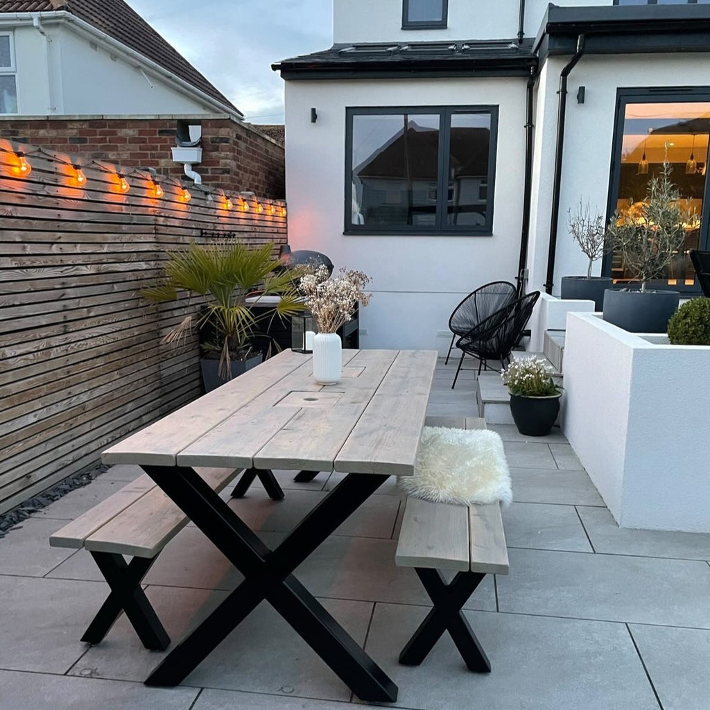 Layering lights is a great way to illuminate a patio area. You can use string lights along a fence, wall or above a seating area. Stake lights are great to use in a flower bed near the patio or you could put a couple either side of an entrance. Outdoor table lamps or fairy lights powered by battery or solar are great to use on outdoor tables.